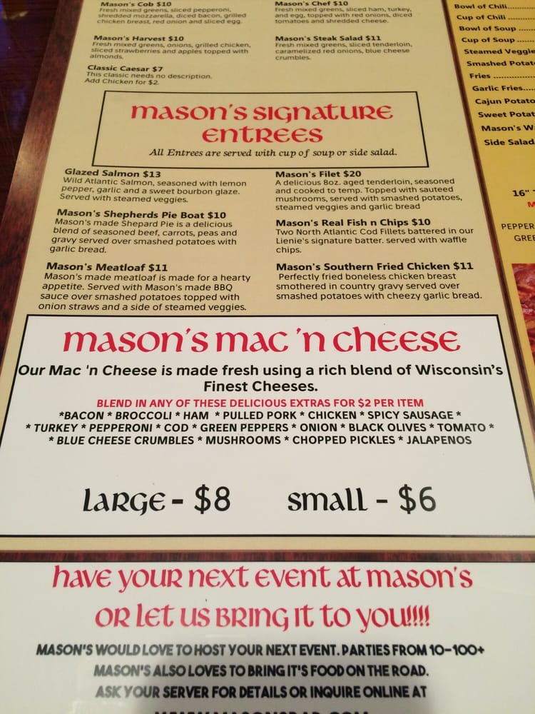 Welcome to Mason's Eatery & Pub, a vibrant hub in Kenosha, WI, known for its delightful burgers, sandwiches, and more. This casual eatery caters to everyone—from families to groups seeking a hearty meal. The menu showcases a tantalizing variety of dishes, including renowned pulled pork nachos, savory pork sliders, and classic shepherd’s pie—all lauded for their flavor and presentation.